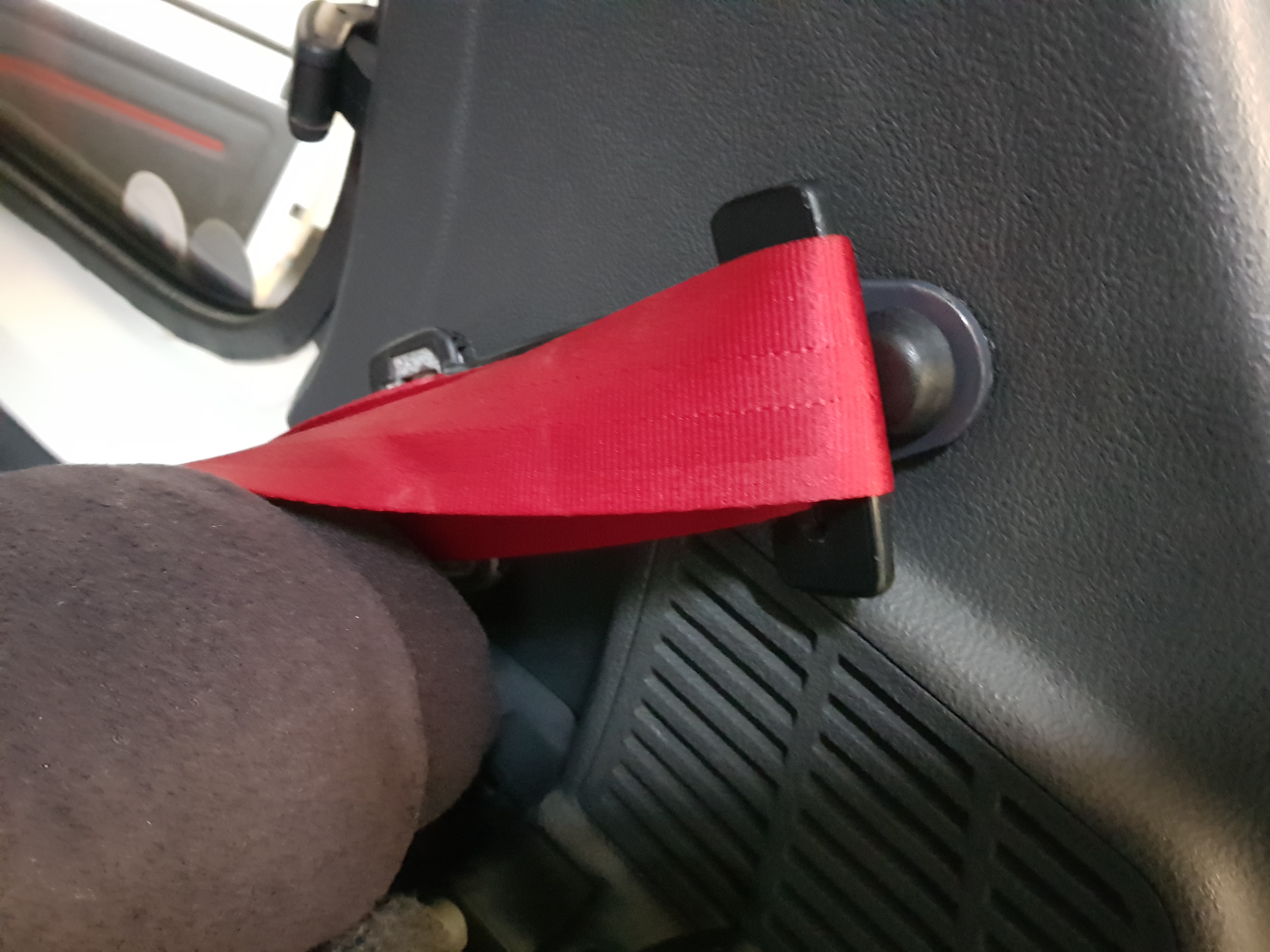 Sur la boucle de là rallye. Celle qui est fixée au panneau de HP, il y a un petit crochet qui est là pour recevoir la boucle de ceinture.