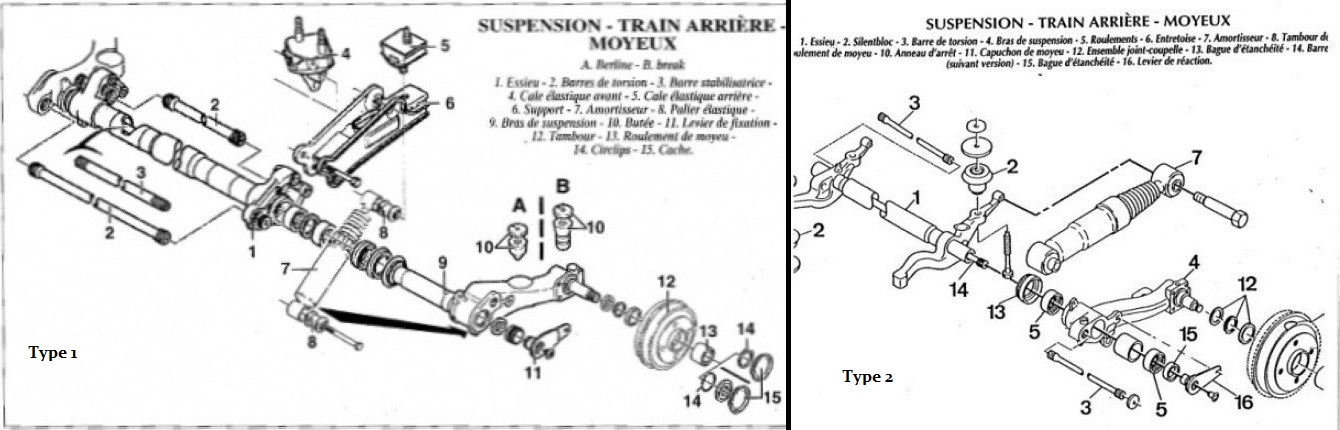 Ceux qui ont les roulements dans la poutre et les axes dans les bras: 205-309-306-ZX-Xsara (j'ai nommé type 1 sur le schéma)