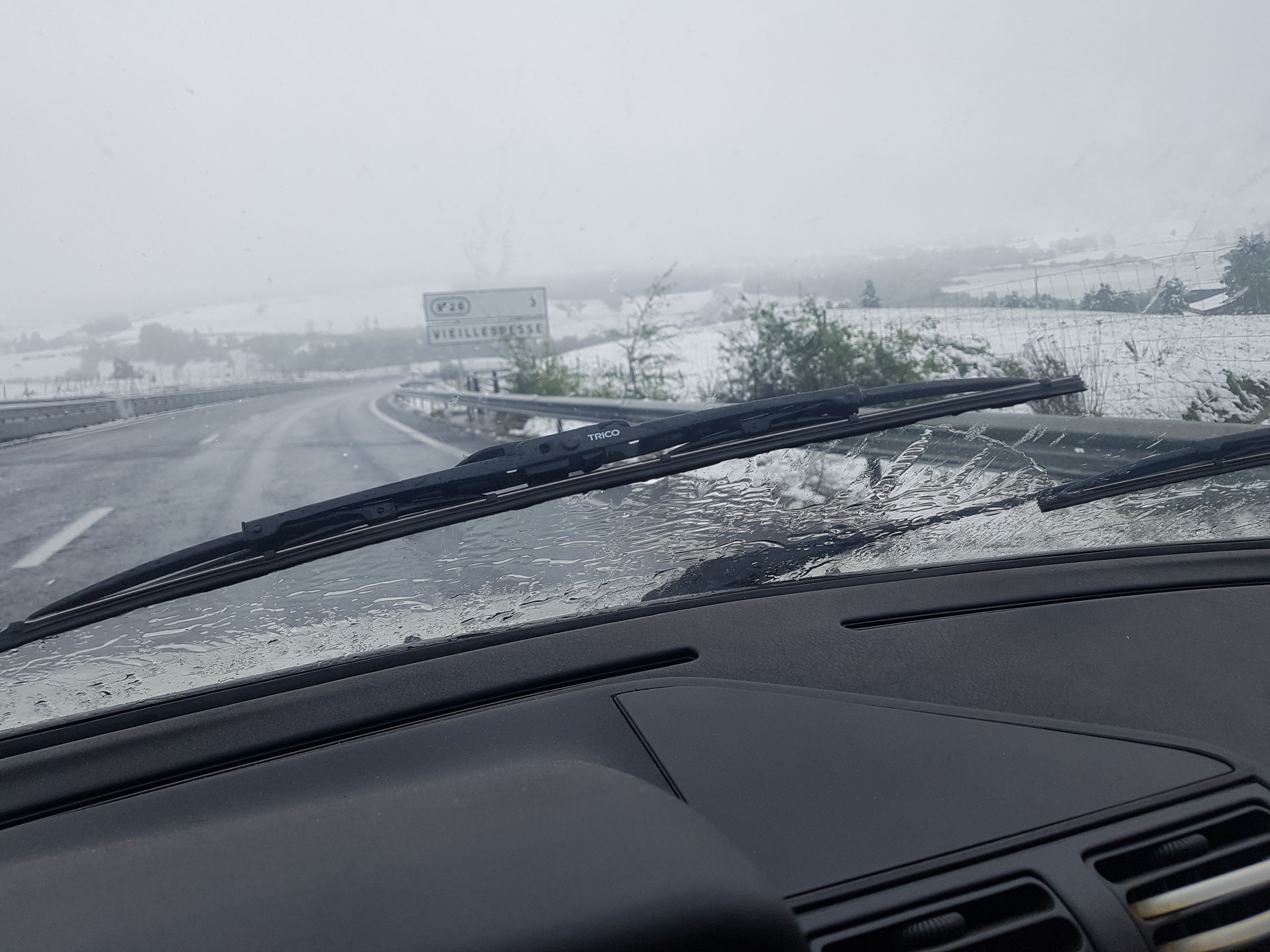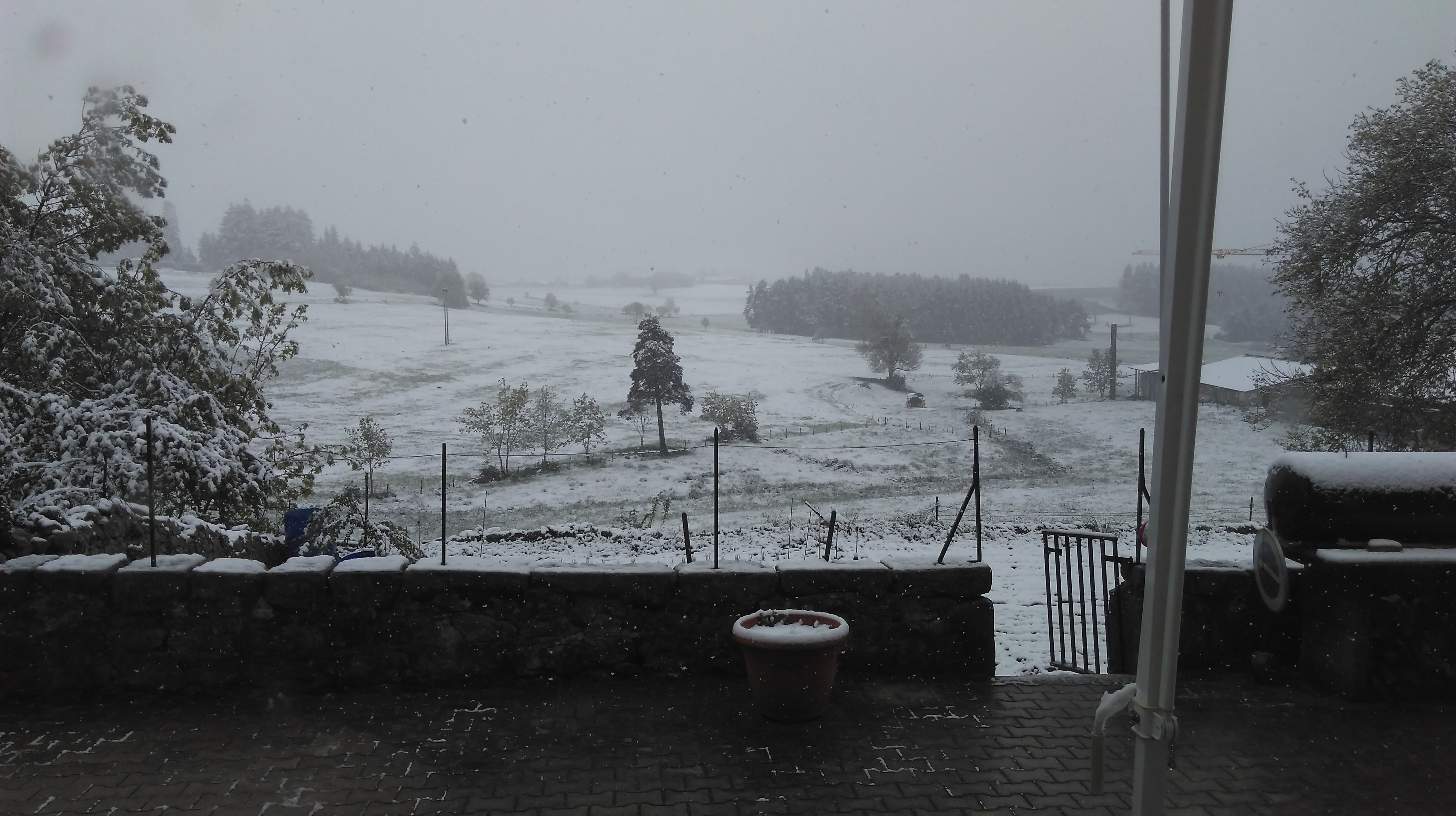 Ah ben.... Jeudi, plein soleil, 35 degrés à l'ombre, hier, orages et déluge de mousson... Aujourd'hui, 10 cm de neige et 0 degré.