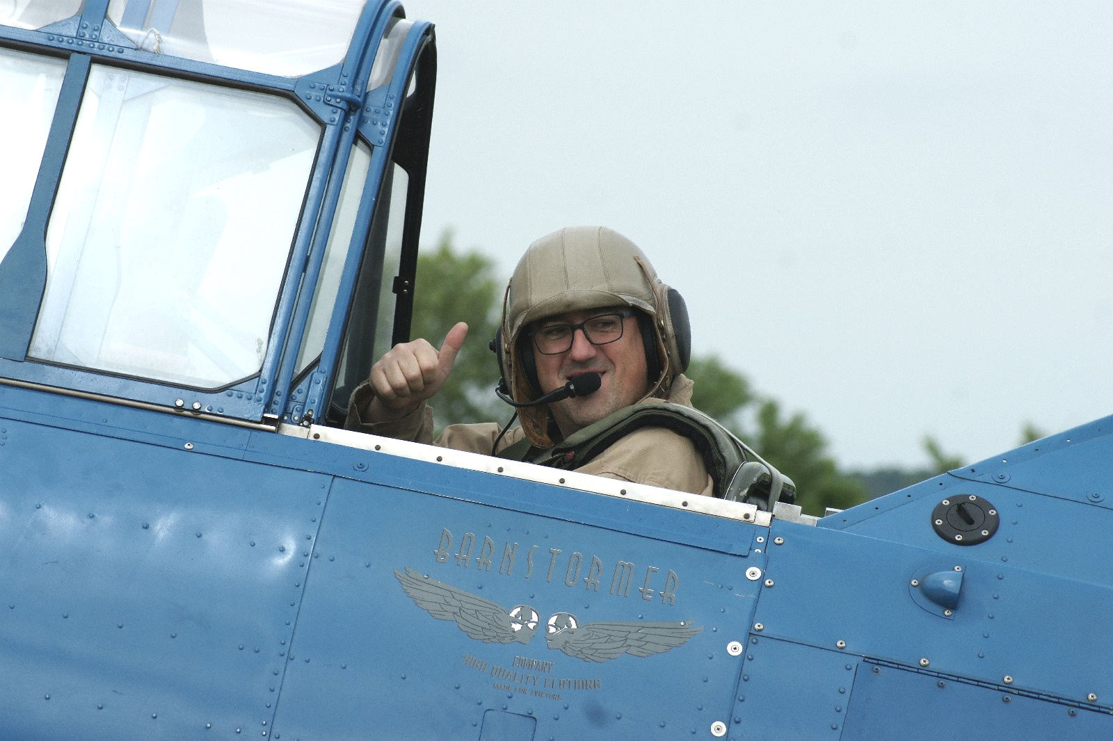 Bref, nous étions encore dans le hangar du B17 lorsque 2 bonhommes en combi marchent vers moi « Julien ? Le T6, c’est le moment ». Troop cool. Je les suis on va vers l’acceuil, il y a un petit salon pour enfiler une combi. Je rencontre mon pilote, je « m’équipe ». On test le casque (taille unique en même temps). Ça met dans l’ambiance. Il m’explique le vol, que lors des phases de voltige il ne faut pas « subir » mais essayer de chercher l’horizon. Il me demande si j’ai déjà piloté, je dis que non, mais que j’ai déjà fait du petit avion, de l’hélico. Il lâche un « ok, je te laisserai les commandes ».